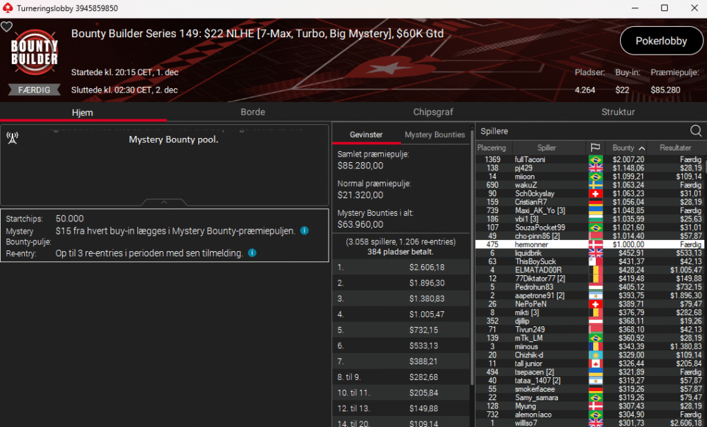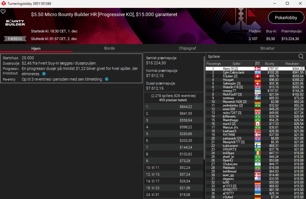 Der var også dansk sejr i den “billige” $5,50 Micro Bounty Builder HR PKO med $15.000 garanteret. Mertz18 var bedst af alle og vandt samlet $1.742. Der var i alt tre danskere dybt i denne turnering (RATM86 og auer_gg var de to andre):