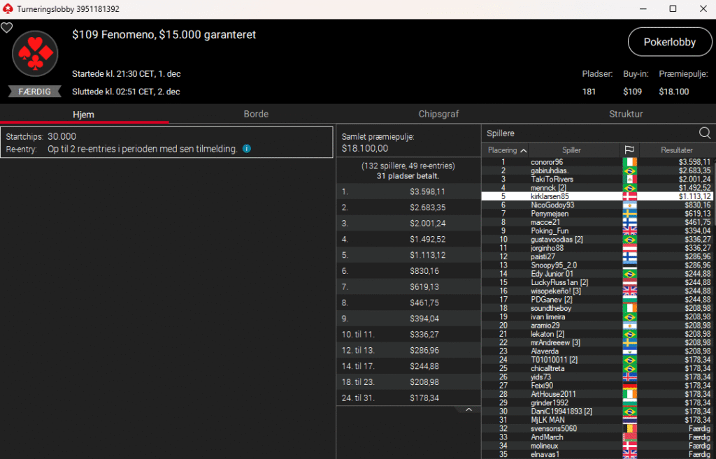 Når IP-adressen er varm, så må man smede. Det tænker kirklarsen85 helt sikkert efter søndagens kæmpe resultat. Mandag var danskeren igen med fremme i den sene $109 Fenomeno med $15.000 garanteret. Her blev det til en beskeden 5. plads og $1.113.
