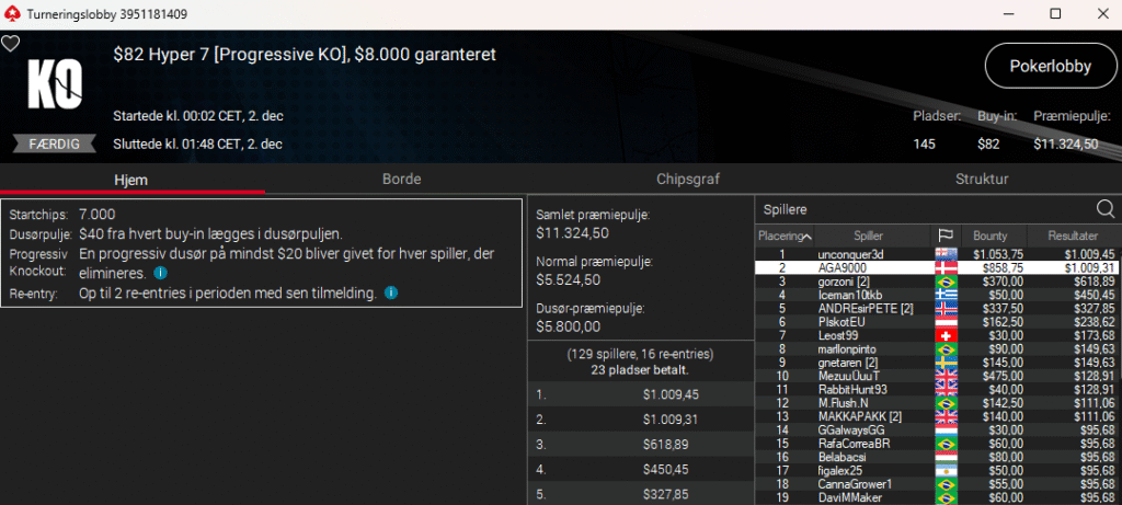 AGA9000 var tæt på, men manglede lige det sidste i $82 Hyper 7 PKO med $8.000 garanteret. Samlet blev præmien på $1.868.
