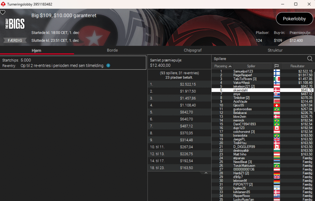 I Big $109 med $10.000 garanteret blev oksendahl nr. 6 til $641 – der var nordisk øverst på resultattavlen idet, at Finland havde tre af de øverste pladser. Danmark havde dog tre spillere i pengene trods alt.