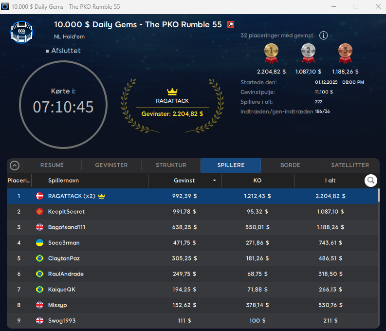 Den første sejr på 888poker, som vi vil nævne, er RAGATTACK der vinder $55 Daily Gems The PKO Rumble med $10.000 garanteret. Sejren giver samlet danskeren $2.205.