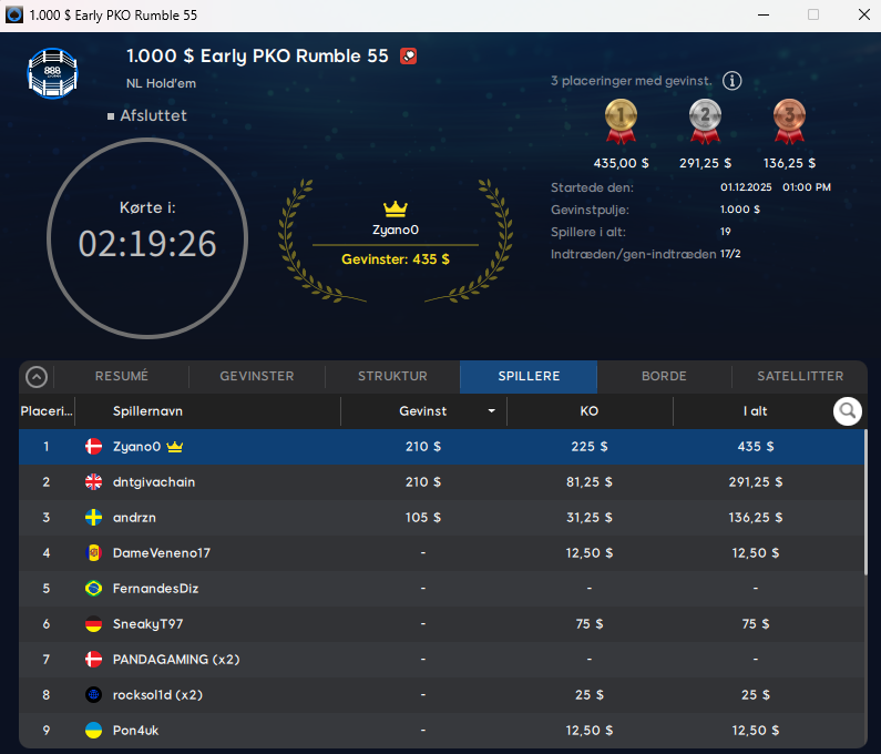 Der var også en mindre sejr til Zyano0. Men en sejr er en sejr, så vi tager den med, fordi vi er i godt humør i dag. Det var i $55 Early PKO Rumble med $1.000 garanteret. Sejren gav danskeren $435 til kontoen.