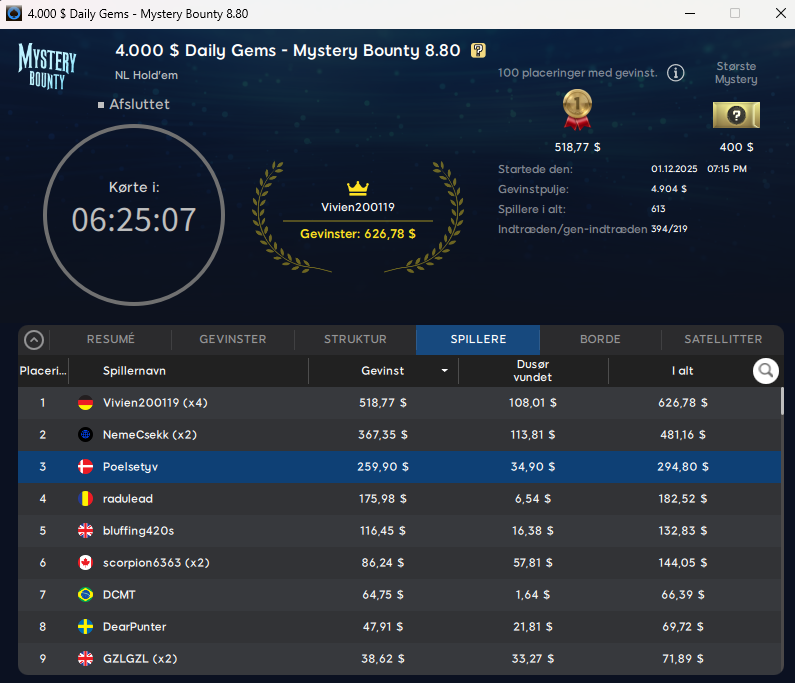 Slutteligt spottede vi Poelsetyv blive nr. 3 i $8,80 Daily Gems Mystery Bounty med $4.000 garanteret. Samlet var præmien på $295.