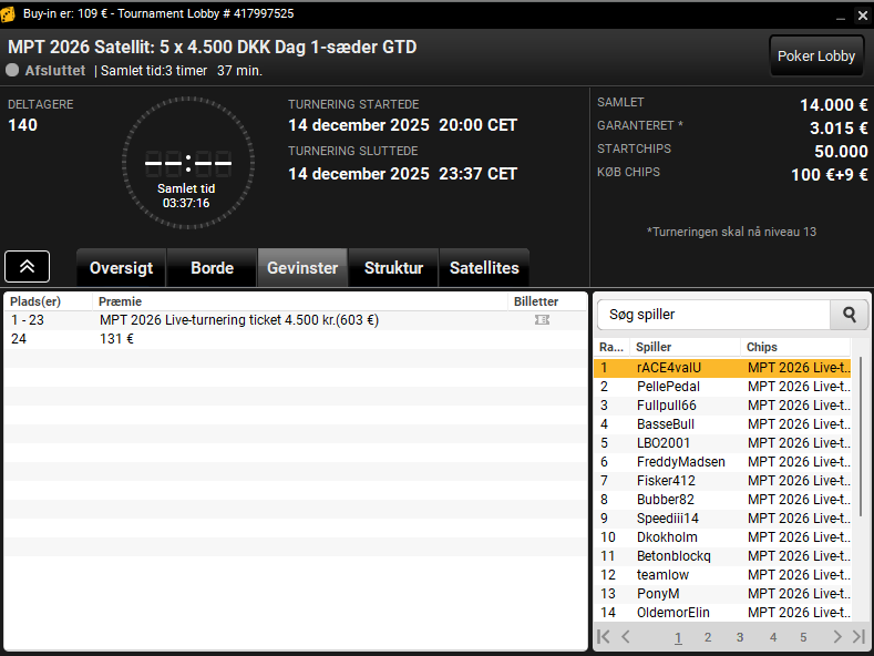 Vi kan starte med en kvalifikationsturnering, som vi ved kun er for spillere bosat i Danmark. MPT-kvallen der startede kl. 20.00. Her var der denne søndag hele 140 entries, hvilket skabte 23 MPT-tickets (á 4.500 kr.).