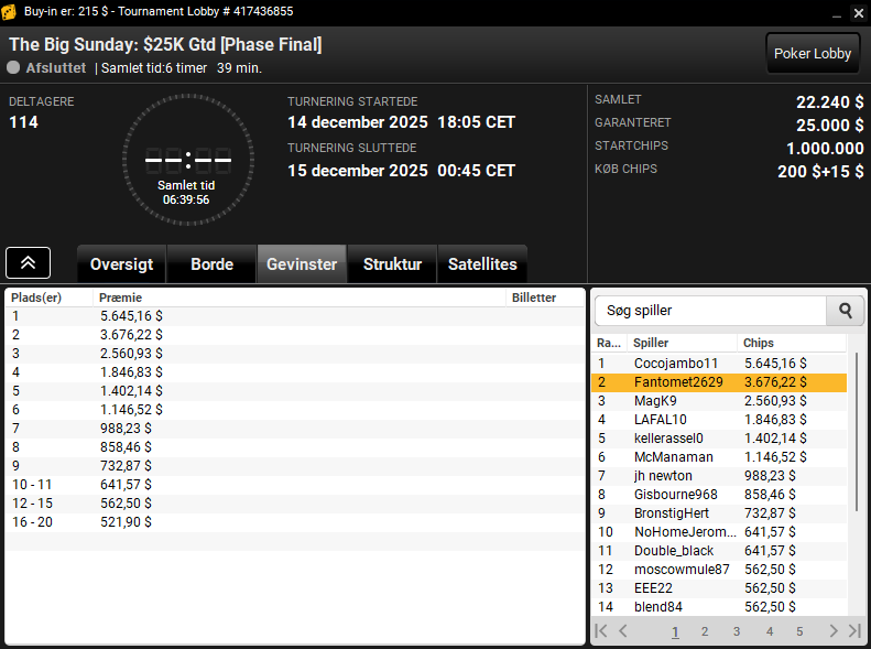 Fantomet2629, der er en af Danmarks største online turneringscrushers, blev nr. 2 i den store $215 The Big Sunday (Phase Final) med $25.000 garanteret. Præmien endte på $3.676. Flot!