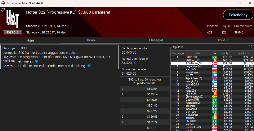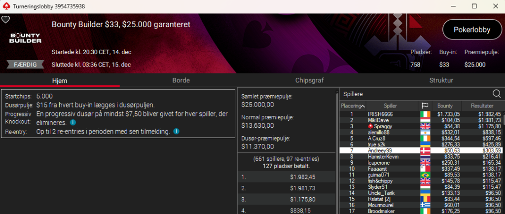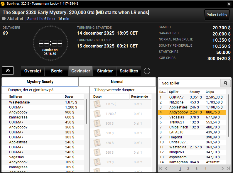 Vi kunne også genkende Andreas “Andybooo9” Brendholdt, der blev nr. 4 i $320 The Super Early Mystery med $20.000 garanteret. Andreas trækker nogle fine bounties og vinder samlet $3.122.