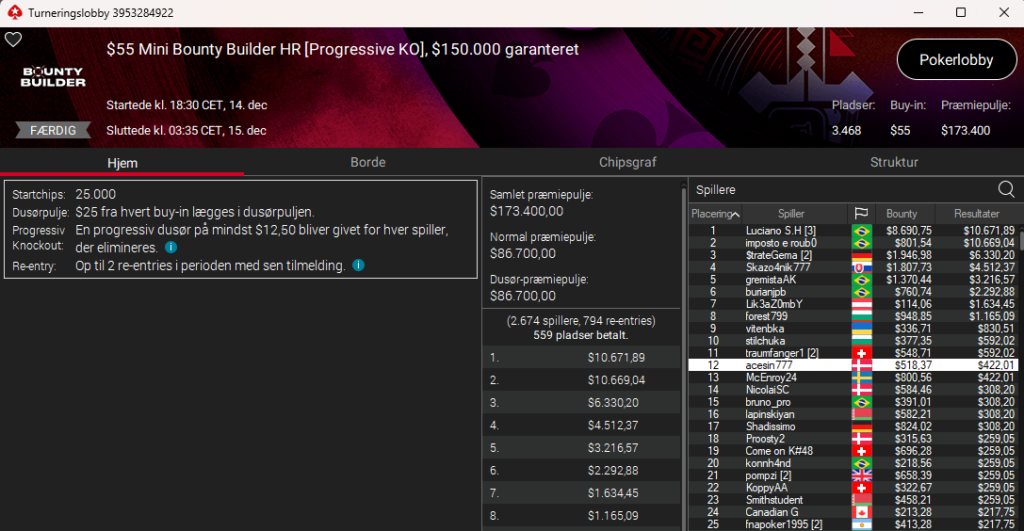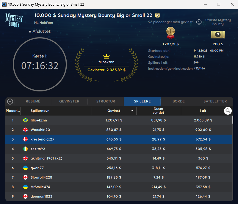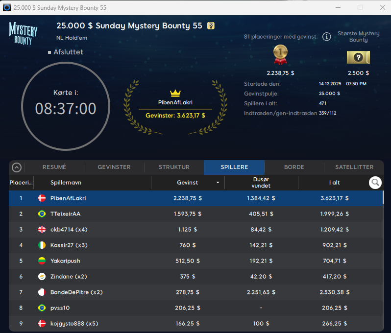 Danskeren med det sjove nick: PibenAfLakri tog sejren i den store $55 Sunday Mystery Bounty med $25.000 garanteret. Samlet vinder “Lakridspiben” $3.623. Stort tillykke.