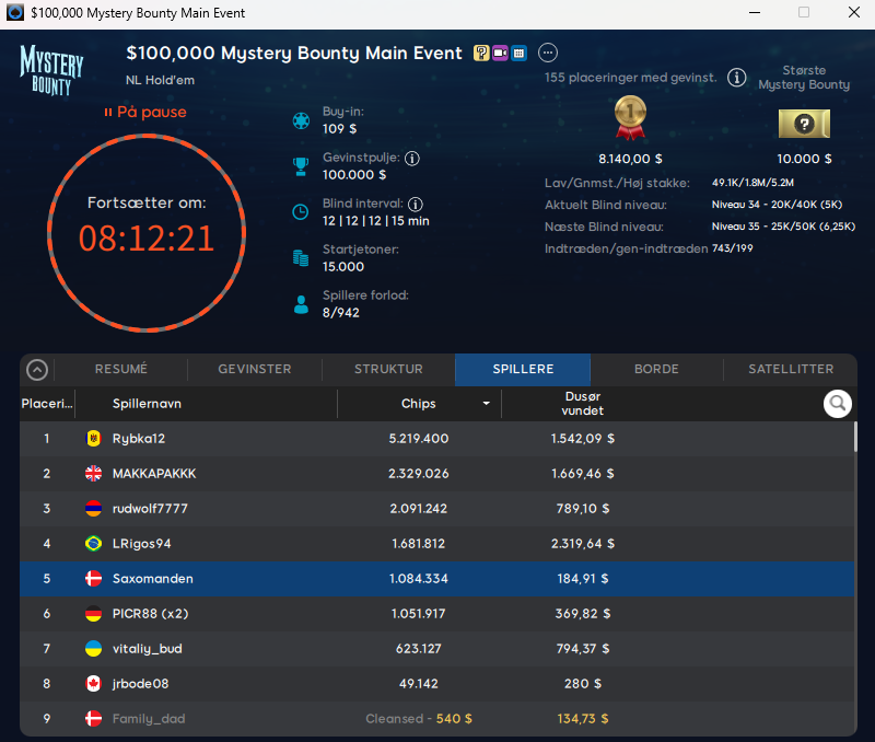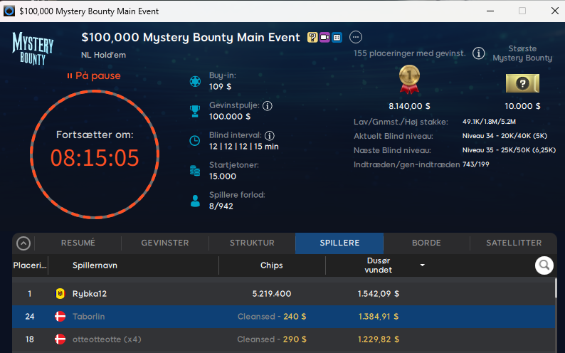 I deres søndagsflagskib $109 Mystery Bounty Main Event med $100.000 garanteret har vi én dansker videre til finaledagen/finalebordet. Men inden da kan vi fortælle om, at Taborlin vinder samlet $1.625 som nr. 24, mens otteotteotte blev nr. 18 og vinder samlet $1.520.