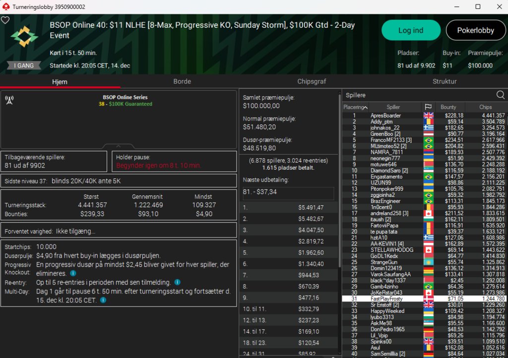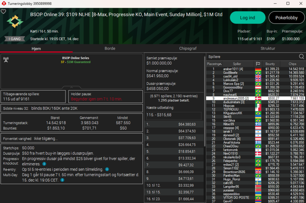 Der blev spillet BSOP Online (Brazilian Series of Poker) og her i Sunday Million udgaven af denne: $109 NLH PKO Main Event med $1 million garanteret var der 9.161 entries. Der er 115 spillere tilbage – heriblandt fire danskere. Disse er: andreassun2005 som nr. 9. NimO1510 som nr. 24 og trissy_123 som nr. 46. Nederst ligger HansDenSvans som nr. 107.