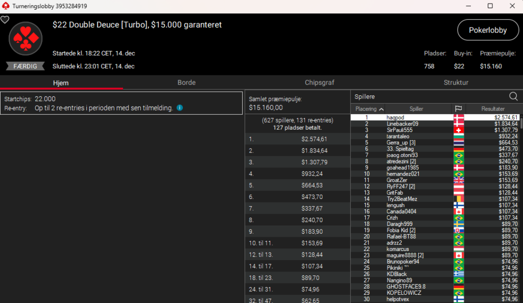 Der var dobbelt dansk øverst i $22 Double Deuce Turbo med $15.000 garanteret. Sejren gik til haqpod, der vandt $2.575, mens Linebacker09 vandt $1.835 på 2. pladsen.