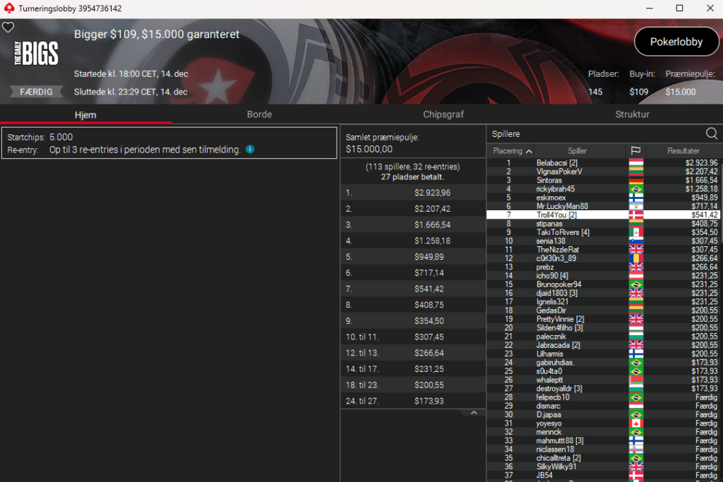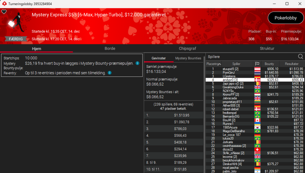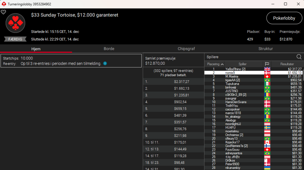 Der var danske flag overalt på denne lobby. I $33 Sunday Tortoise med $12.000 garanteret blev nomis9 nr. 2 til $1.692 – men som man kan se nedenfor, så var der masser af andre danskere dybt i denne tour: