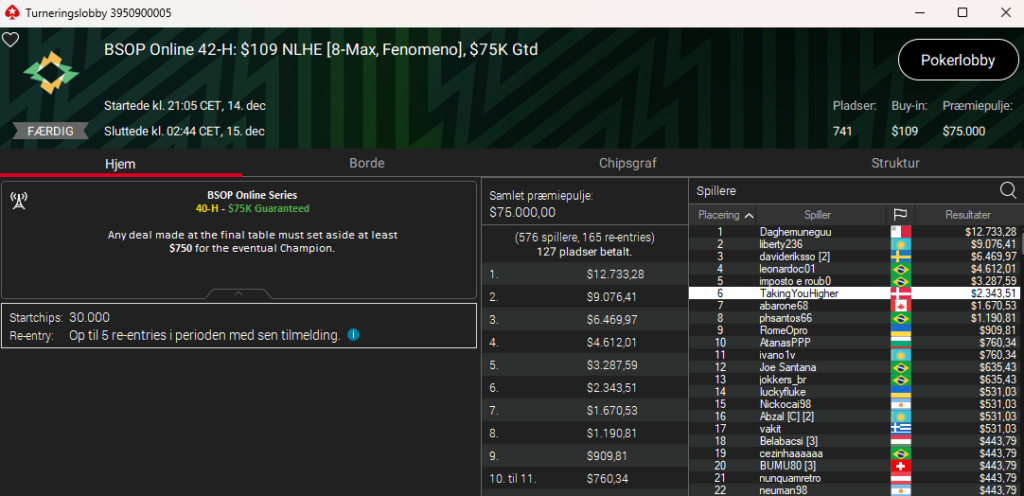 Fenomeno havde fået det fine navn $109 BSOP Online 42-H: NLH 8-Max Fenomeno med $75.000 garanteret. Her blev TakingYouHigher, som jo lyder som en popsang, nr. 6 til $2.344.