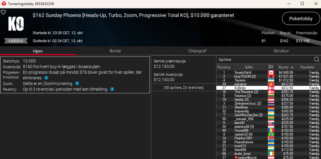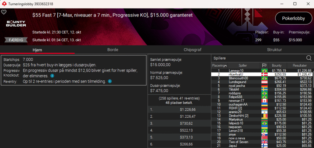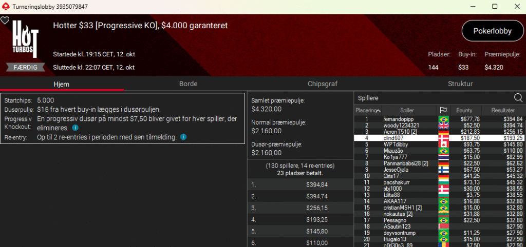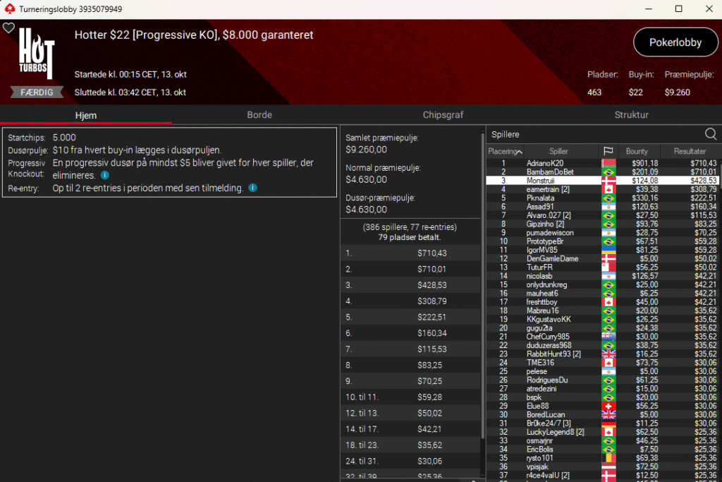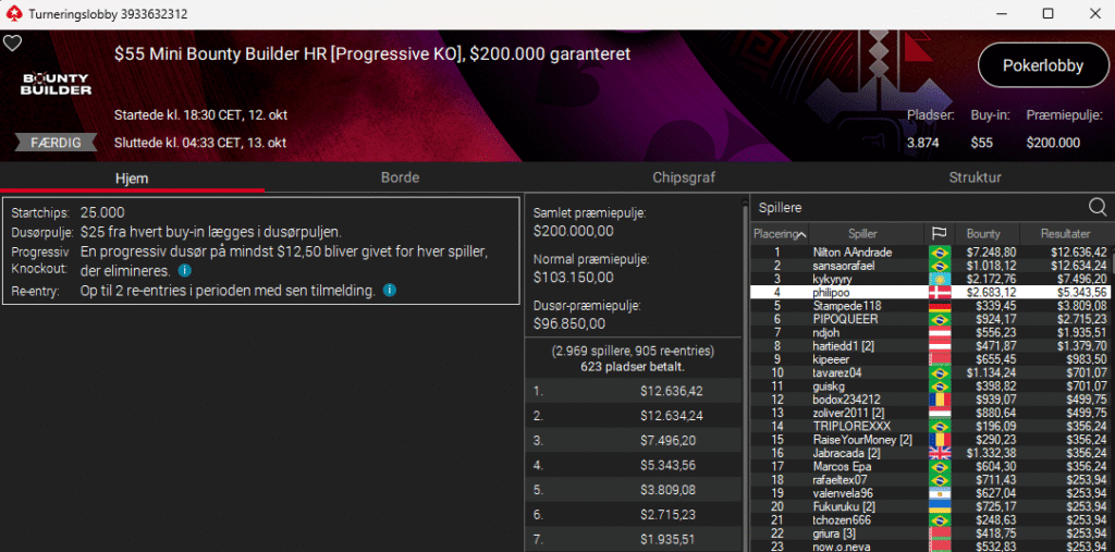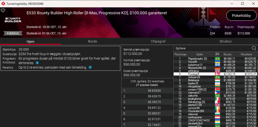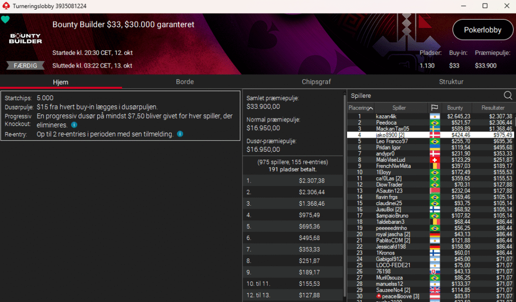 Det blev til en tredjeplads og $1.400 til jako8900 i Bounty Builder $33 med $30.000 garanteret. Endnu en af de turneringer med god værdi på PokerStars.