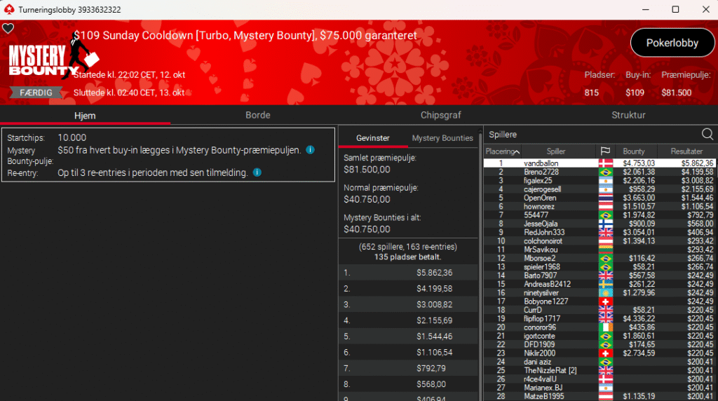 Det blev til en flot dansk sejr i $109 Sunday Cooldown Turbo Mystery Bounty med $75.000 garanteret. Sejren gik til danskeren med det sjove nick: vandballon. Samlet tager danskeren $10.615. Stort tillykke!