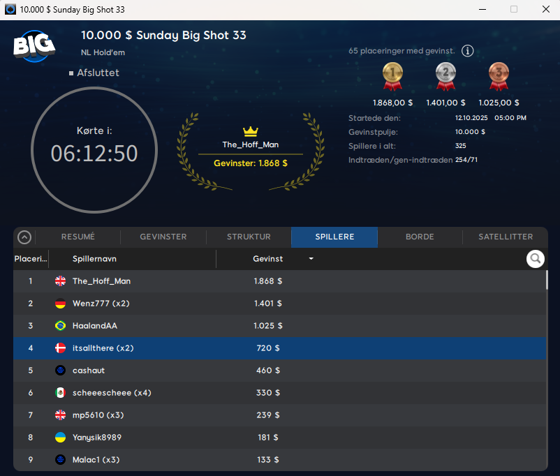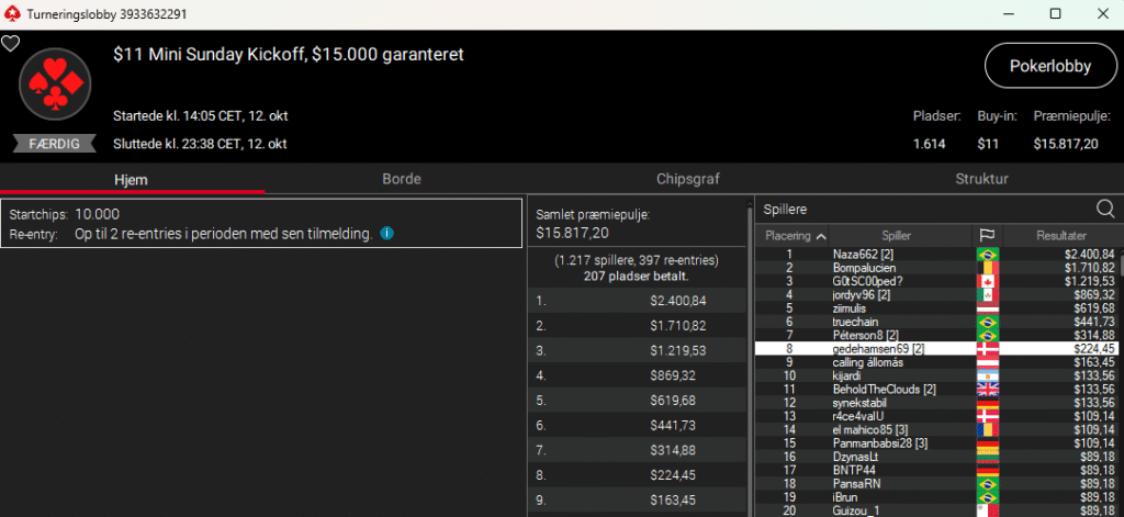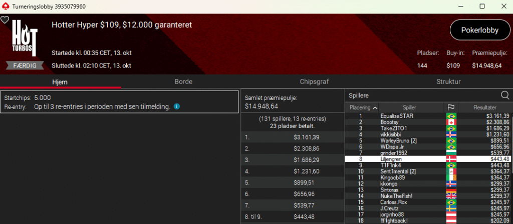 Dansk sejr fik vi også i $109 Sunday Wrap-Up 9-Max Hyperturbo med $12.000 garanteret. Sejren gav kirklarsen85 en fin præmie i en hyperturbo turnering på hele $3.171.