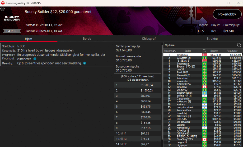 Det blev også til dansk sejr i Bounty Builder $22 med $20.000 garanteret. Det var en af de sene turneringer, der startede kl. 22.30 søndag aften og først sluttede i morges kl. 05.24. Derfor var modstanderne til amirsheva også hovedsageligt spillere fra tidszonen på den anden side af Atlanten. Danskeren viser dog dem alle, hvem der er bedst og vinder samlet $2.780.