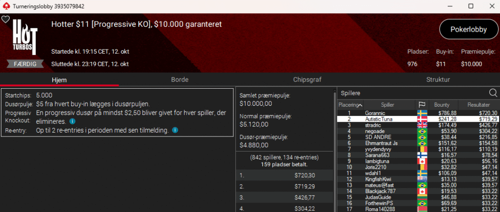 Det blev også til en andenplads i Hotter $11 PKO med $10.000 garanteret til AutisticTuna. Samlet vinder danskeren $961.