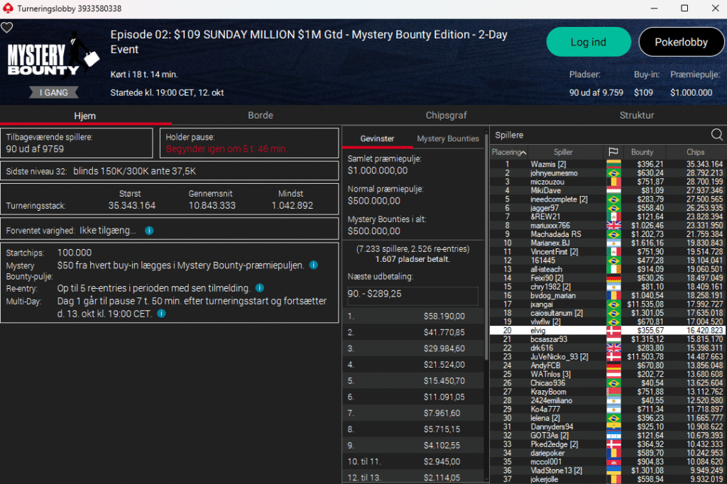 Der er hele fire spillere tilbage blandt de sidste 90 spillere, der gik videre til dag 2 i $109 Sunday Million Mystery Bounty med $1 million garanteret. Vi har elvig på 20. pladsen, JuVeNicko_93 på 23 pladsen (danskeren har allerede vundet $11.504 i bounties), Pked2edge som nr. 33 og InsaneGrip som nr. 56. I turneringen var er en $100.000 Mystery Bounty, som desværre ikke gik til en af danskerne.