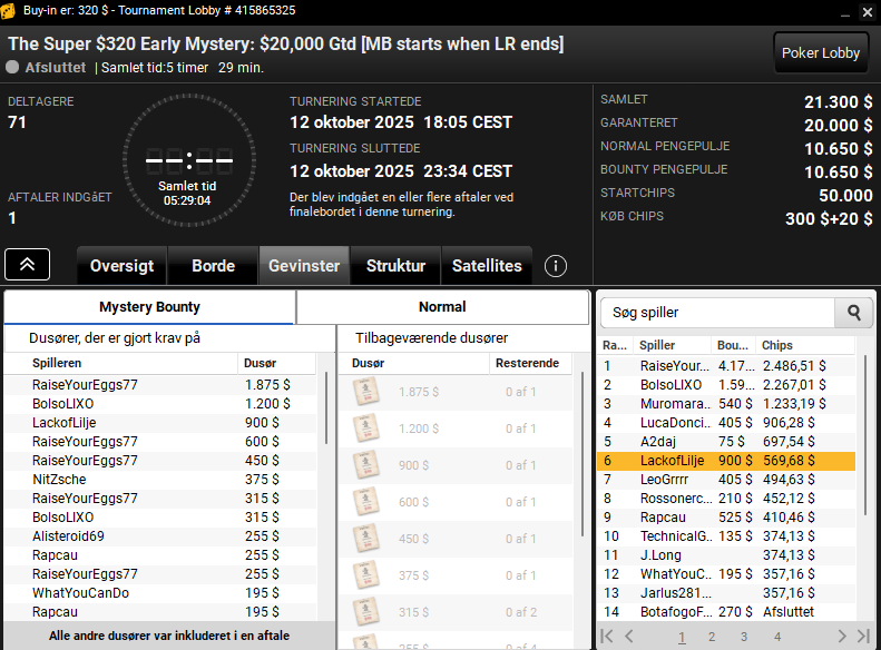Det var Nikolaj “LackofLilje” Liljengren , der blev nr. 6 i The Super $320 Early Mystery med $20.000 garanteret. Samlet vinder LackofLilje $1.469.
