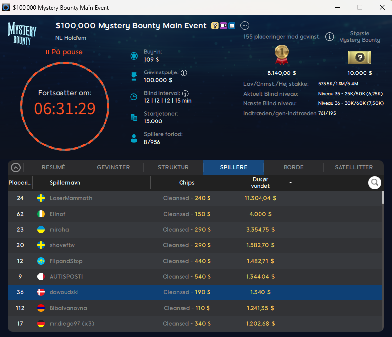 Det var ingen danskere videre i søndagsflagskibet Mystery Bounty Main Event med $100.000 garanteret. Dog fandt vi én dansker med en fin præmie i den turnering via en $1.000 bounty. Det var dawoudski, der samlet vinder $1.530.