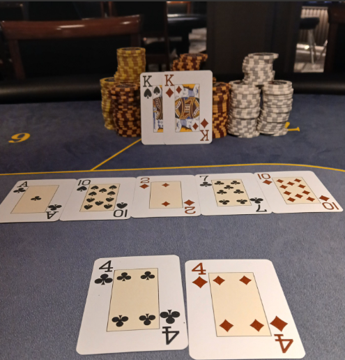 De to sidste spillere var herefter Tue og Holger, og afgørelsen faldt i en klassisk all-in preflop, hvor kongerne holdt mod firerne og lukkede turneringen. Tue Sørensen fik på andenpladsen til 7.794 kr., mens Holger kunne indkassere 11.442 kr. for sejren.