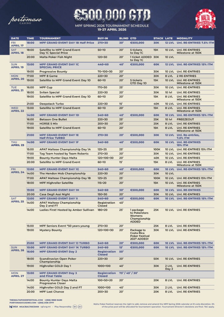 Festivalen finder sted fra 20. april til 27. april 2026 på det ikoniske Portomaso Casino, hvor både turneringer, cashgames og sociale aktiviteter smelter sammen til en uge fyldt med oplevelser – både ved og væk fra bordene.