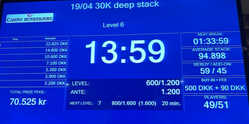 Næste gang der spilles turneringspoker på Casino Munkebjerg er på tirsdag den 22. april kl. 18.45, hvor der igen er deepstack poker med 25.000 chips i startstack og et buy-in på 590 kr. (500 kr. + 90 kr.).
