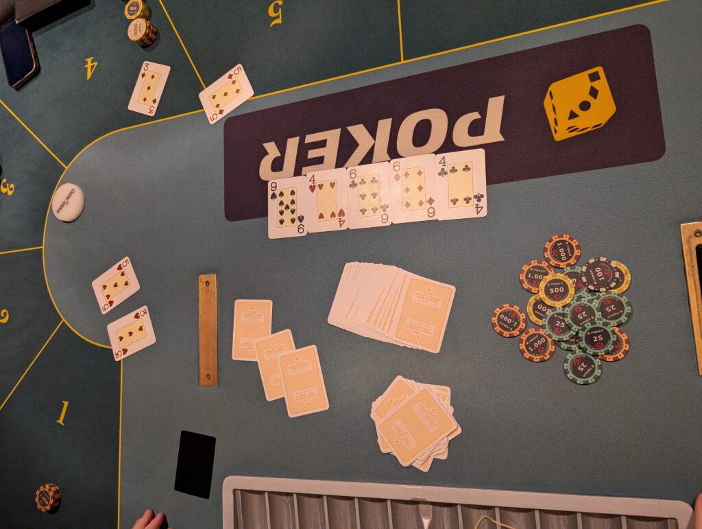 I rebuy-perioden udspillede der sig en hånd, hvor to spillere endte all-in på floppet i en multiway-pot. “Jeg skal ramme,” lød det næsten i kor mellem Carsten Sig og en ukendt spiller, der til dagligt ofte ses i pokerkælderen på Casino Munkebjerg. Hånden blev afgjort uden den store spænding, da de endte med samme resultat og delte potten.