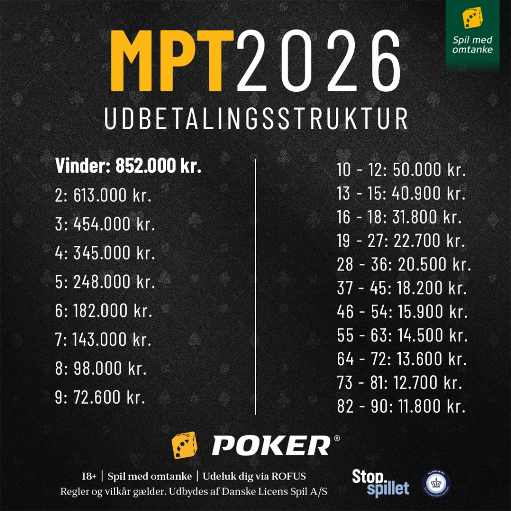 I dag skal vi have fundet en ny MPT-vinder. De ni spiller kommer tilbage kl. 15.00 for at afslutte en succesfuld MPT Main Event 2026. Livestreamet starter på Danske Spil Poker kl. 15.30, hvor der er en kæmpe freeroll.