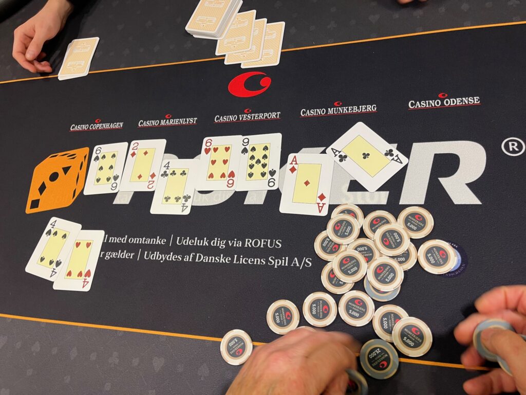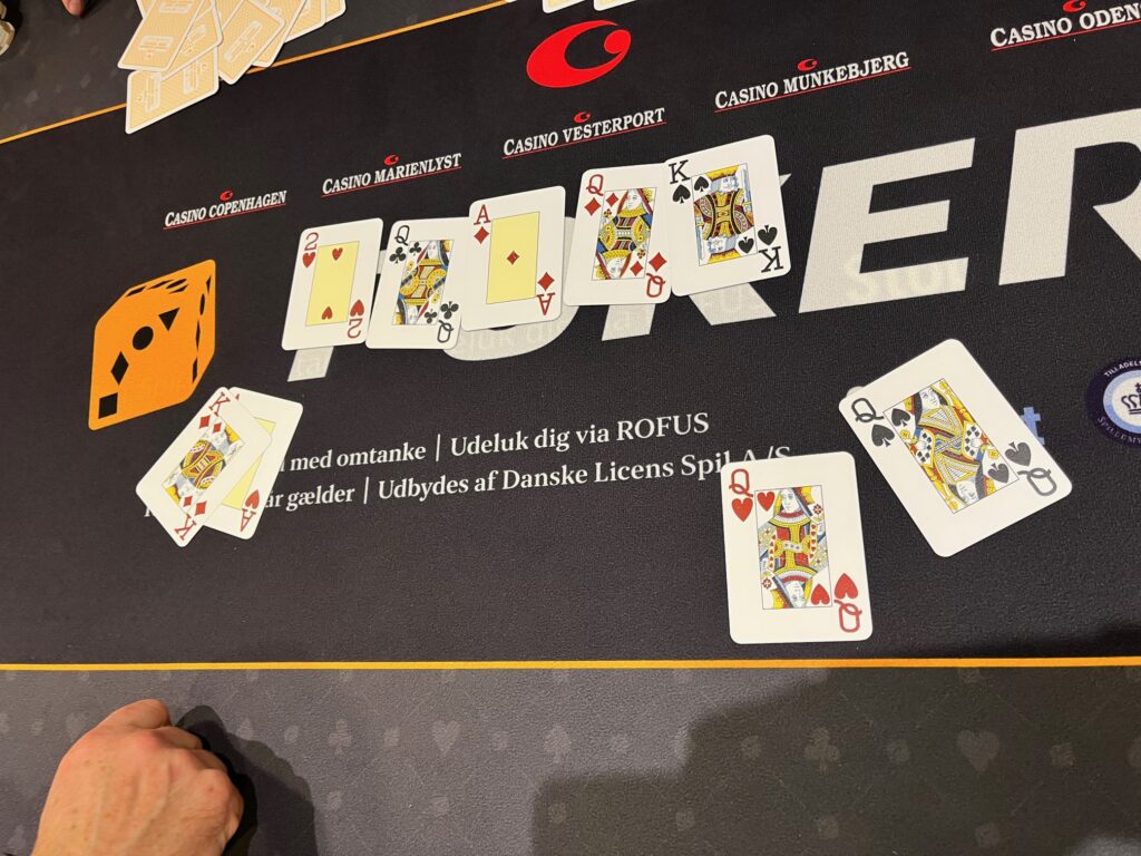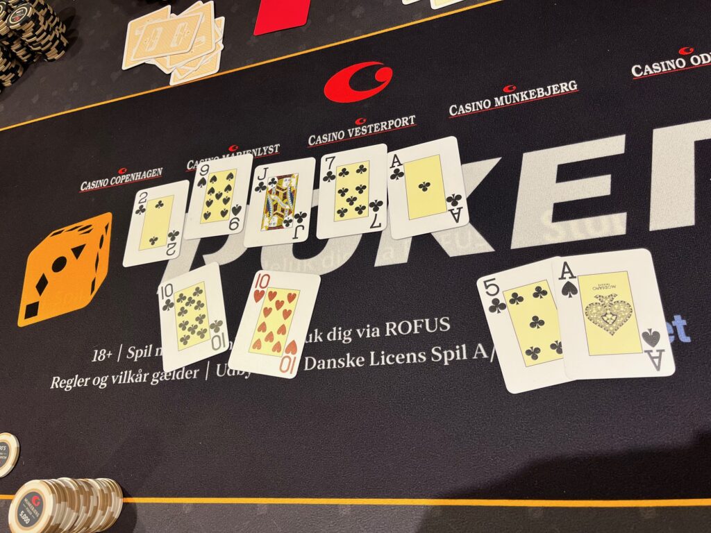 Efter de ti på finalebordet var fundet og de første par spillere var bust, så var det Henrik Mortensen som ryger som bubbleboy i et klassisk flip med AK mod Henrik Andersen, der havde damerne. Runout er ikke så klassisk – AK rammer to par, men damerne rammer quads: