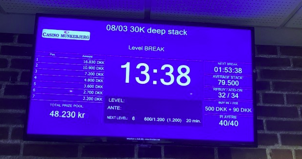 Der var 40 spillere til start kl. 18.30 på Casino Munkebjerg i Vejle til ugeturnering. Disse 40 spillere lavede 32 re-entries og 34 add-ons, så præmiepuljen endte på 48.230 kr. og penge til top-7.