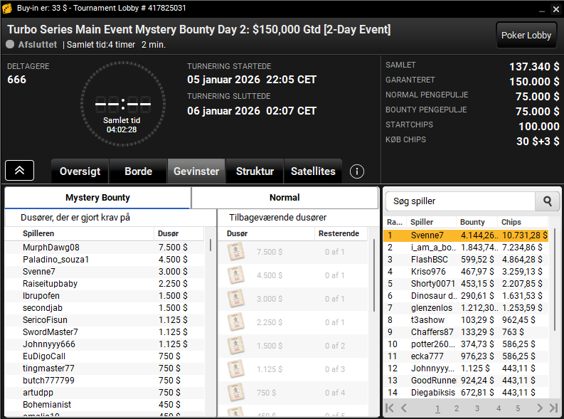 Sejren indeholdt blandt andet en $3.000 Mystery Bounty til Svenne7 og samlet $4.144 i bounties.