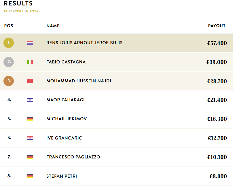 Turneringen sluttede med at Rens Buijs kommer tilbage i heads-up duellen og slår Fabio Castagna.