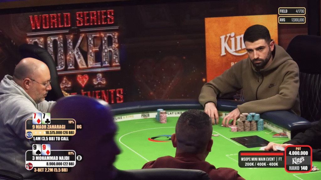 9erne bliver til et fuldt hus på river og pludselig er Mohammed tilbage i førersædet. Zaharagis er efterladt med én enkelt big blind og ryger kort tid efter som nr. 4.