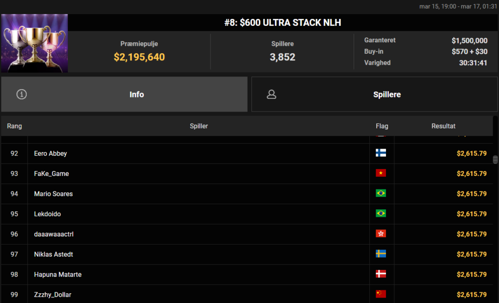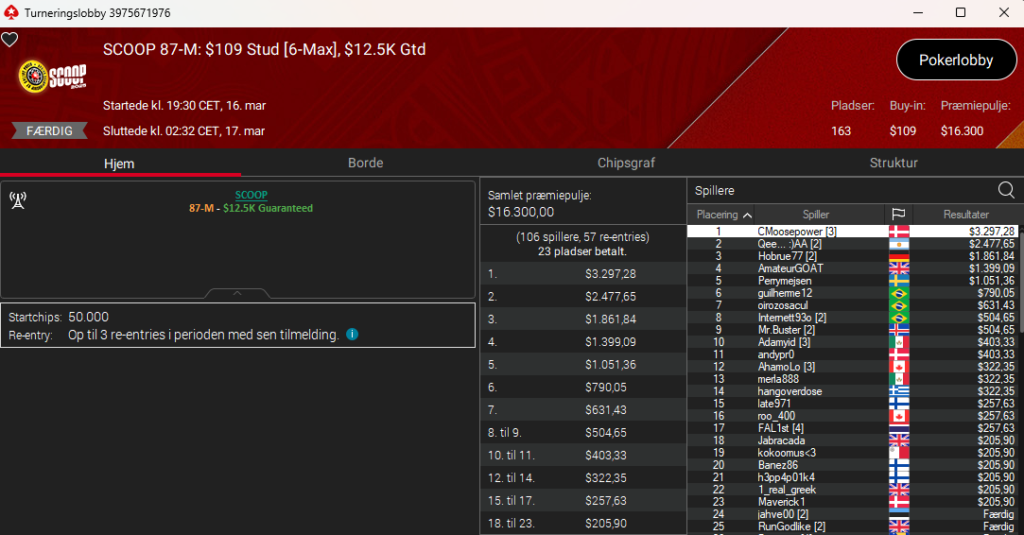 Som nævnt vandt Christian “CMoosepower” Elgstrøm også en SCOOP-titel. Denne gang var det i SCOOP 87: $109 Stud 6-Max med $12.500 garanteret. Sejren gav endnu et trofæ og $3.297. Tillykke tillykke.