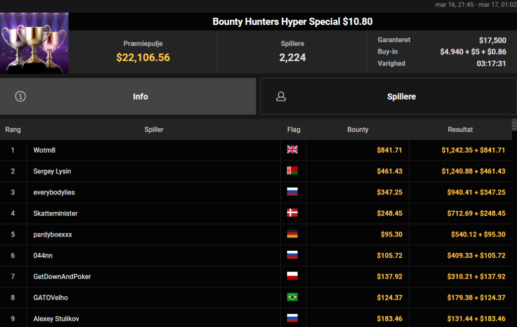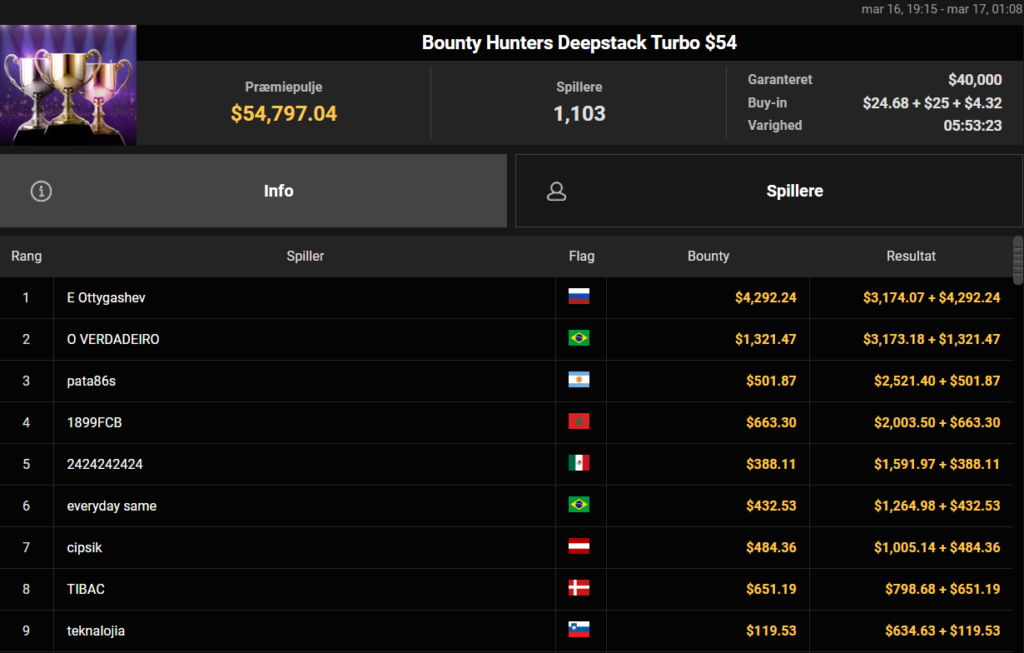 Det var også tæt på for TIBAC i $54 Bounty Hunters Deepstack Turbo med $40.000 garanteret. Præmien for 8. pladsen endte på samlet $1.450.