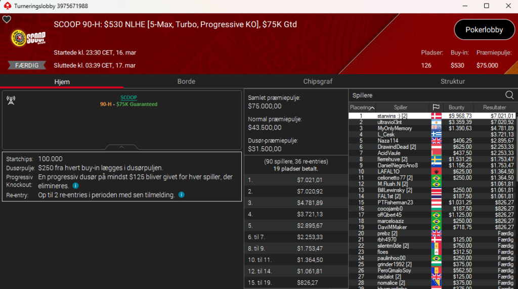 Det var en følelsesladet Daniel “starwins” Petersen på livestreamet i går på Twitch/Youtube. Daniel fik sin anden SCOOP-titel i årets mesterskaber og tredje i alt. Denne gang skete det i SCOOP 90: $530 NLH 5-Max Turbo PKO med $75.000 garanteret. Sejren gav Daniel $16.990. Stort tillykke.