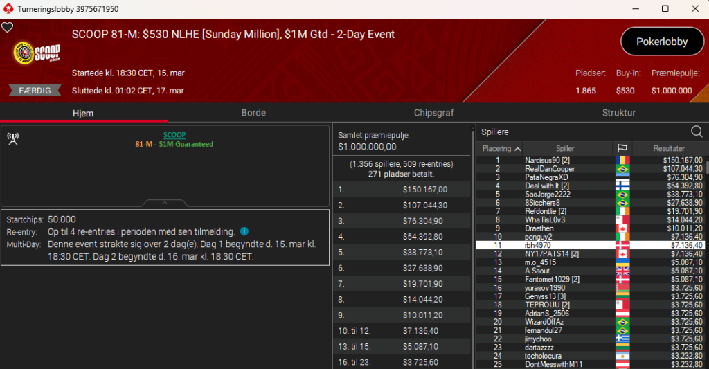 I Sunday Million, der i anledning af SCOOP har fået det fine navn; SCOOP 81: $530 NLH Sunday Million med $1 million garanteret, var der overlay pga. blot 1.865 entries. Der var danskere på 11. og 15. pladsen. Det var Fehim “rbh4970” Hajdari som nr. 11 til $7.136, mens Fantomet1029 blev nr. 15 til $5.087.
