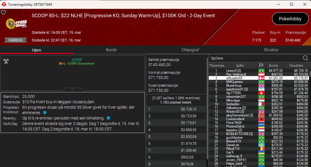 Der var også dansk succes i SCOOP 80: $22 NLH PKO Sunday Warm-Up med $100.000 garanteret. Her var det roflcopter88, der blev nr. 3 til samlet $6.867. Hvis du kan genkende det nick, så er det nok fordi, at roflcopter88 blev nr. 2 i den store Sunday Million 17 års jubilæumsturnering til $723.474 i marts 2023.