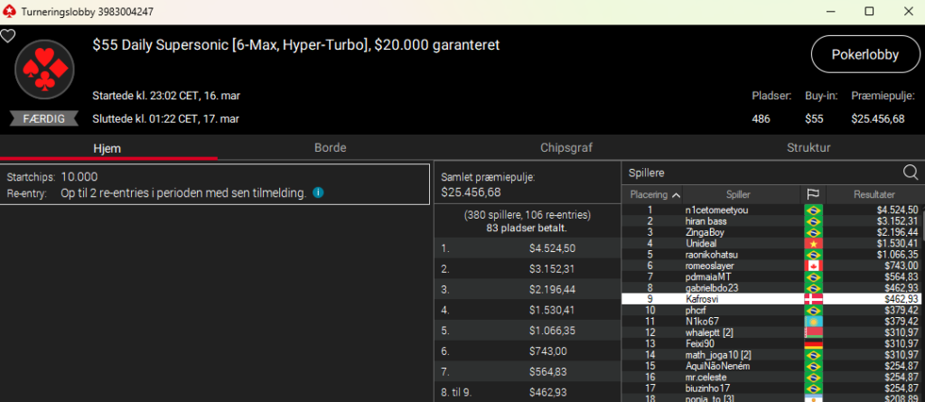 Vi fandt også to mindre resultater til Kafrosvi fra sent natten til tirsdag. Den første var i $55 Daily Supersonic 6-Max Hyper Turbo med $20.000 garanteret. En 9. plads til $463.