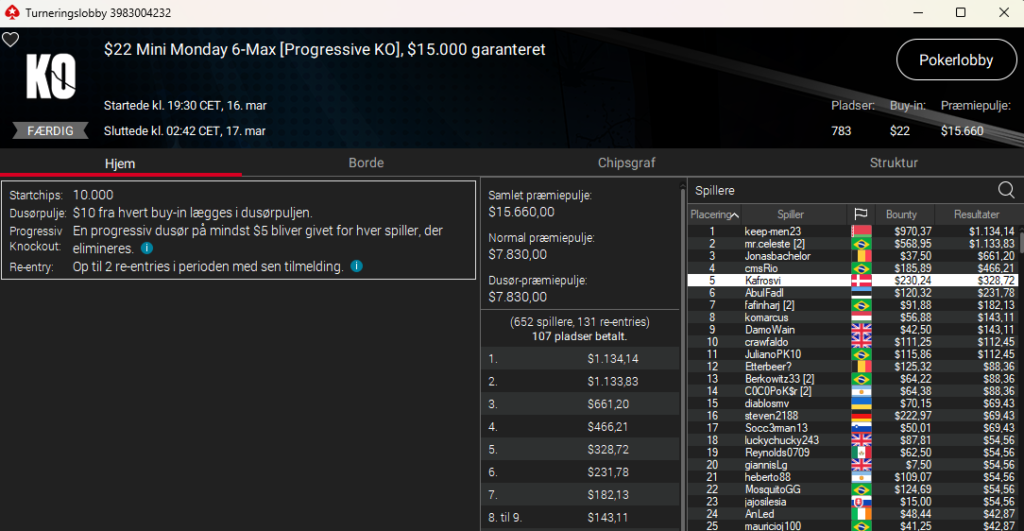 Samt en 5. plads til Kafrosvi i $22 Mini Monday 6-Max PKO med $15.000 garanteret til samlet $559.