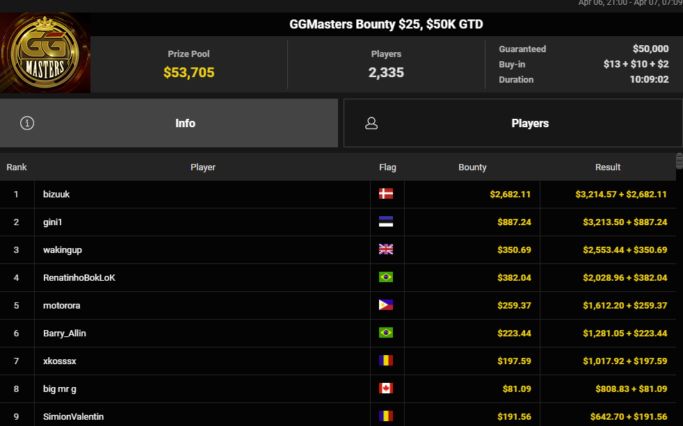 Det var faktisk en $25 version, at danske bizuuk vandt i nat. Sejren gav samlet $5.897. Ikke ringe for en $25-turnering. Det var altså i $25 GGMasters Bounty med $50.000 garanteret at sejren kom i hus. Der var 2.335 entries og turneringen tog lige over ti timer. Tillykke til bizuuk.