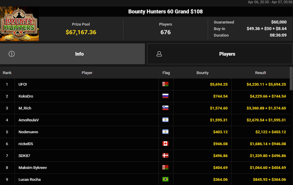 SDK87 fik også en 7. plads til samlet $1.836 i $108 Bounty Hunters 60 Grand med $60.000 garanteret.