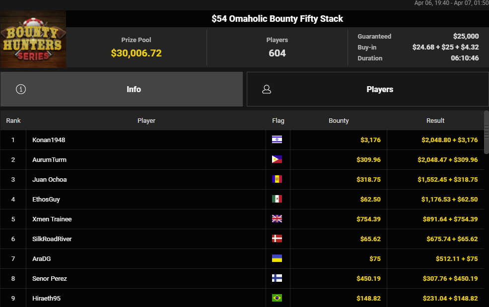 Det blev også til en 6. plads til SilkRoadRiver i $54 Omaholic Bounty Fifty Stack med $25.000 garanteret. Præmien endte samlet på $741.