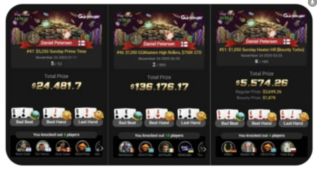 Dansk Poker er tilbage på pinden efter en stor weekend med liveblog fra Mystery Bounty 2025 på Casino Copenhagen og i denne artikel finder I søndagens resultater på onlinefronten.. hvor vi starter med GG Poker, de øvrige sites kommer løbende.