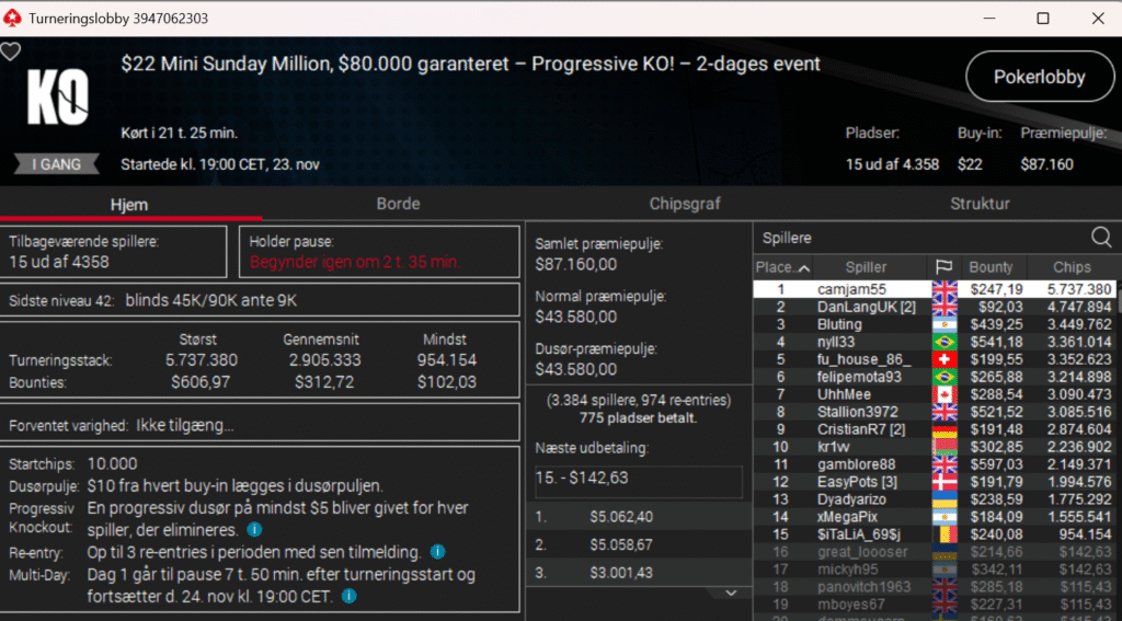 $22 Mini Sunday Million, $80.000 garanteret – Progressive KO! – 2-dages event.