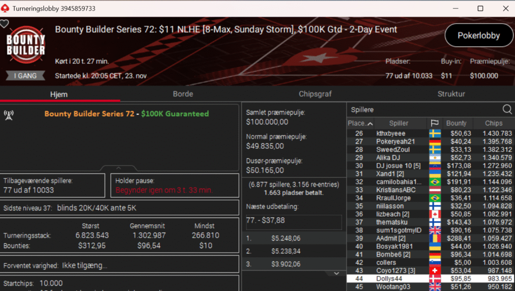 Dollys44 er videre til finalen, hvor der nu er 77 spillere tilbage. Danskeren ligger i den tunge ende af feltet som nr. 44, men har stadig muligheder for at spille sig helt frem. Der venter $5.248 plus bounties til vinderen.