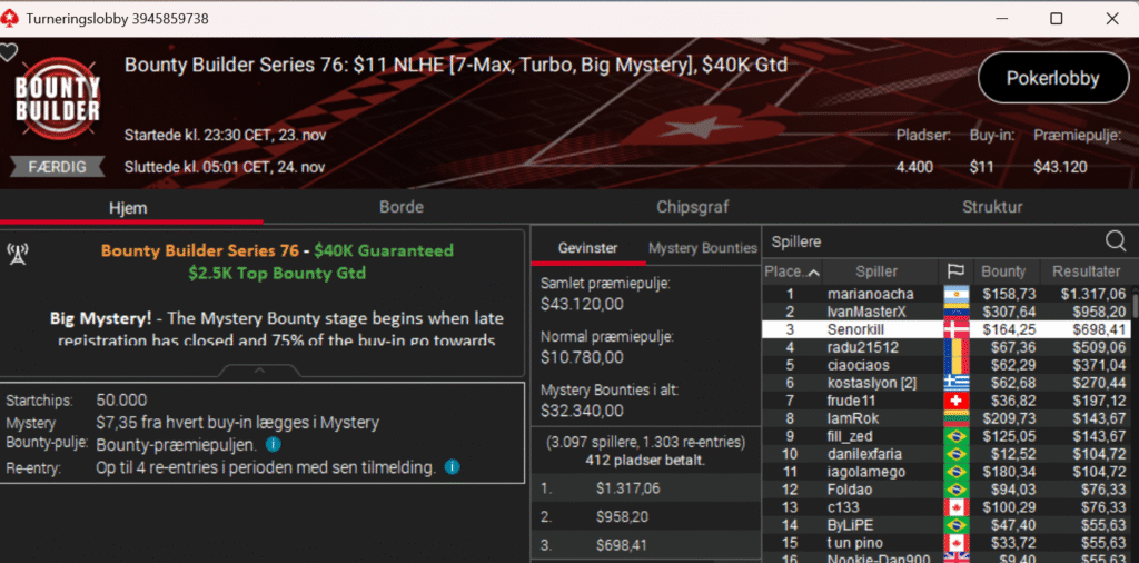 Det blev til en flot tredjeplads og i alt $862 i Bounty Builder Series 76: $11 NLHE (7-Max, Turbo, Big Mystery), $40K Gtd. til Senorkill.