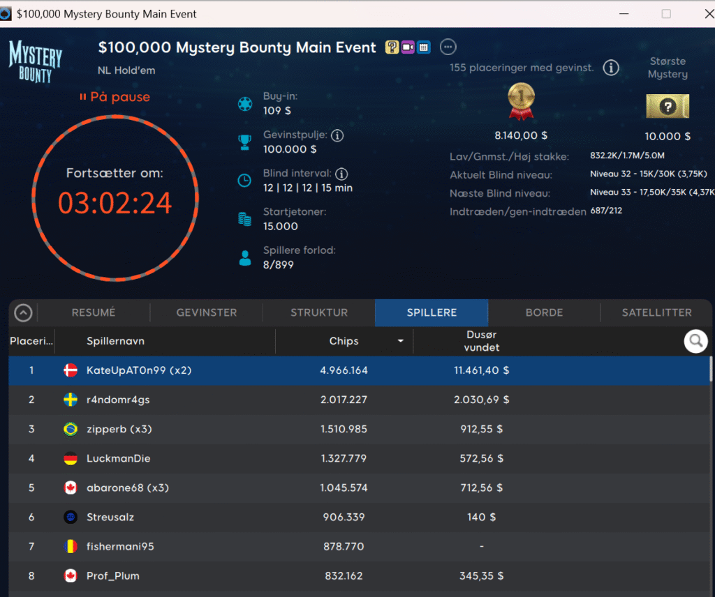I $100,000 Mystery Bounty Main Event er KateUpATOn99 i front ved finalens start mandag aften. Danskeren har vundet den store bounty på $10.000 og et godt bud på at nappe sejren og de $8.140. Finalen vises i aften på Twitch – 888pokerTV.