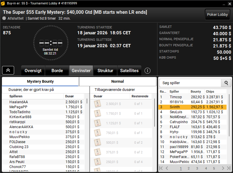 En af dem vi kender er Svinth – som er Simon Svinth. Han blev nr. 3 i $55 The Super Early Mystery med $40.000 garanteret. Samlet blev præmien på $1.855.